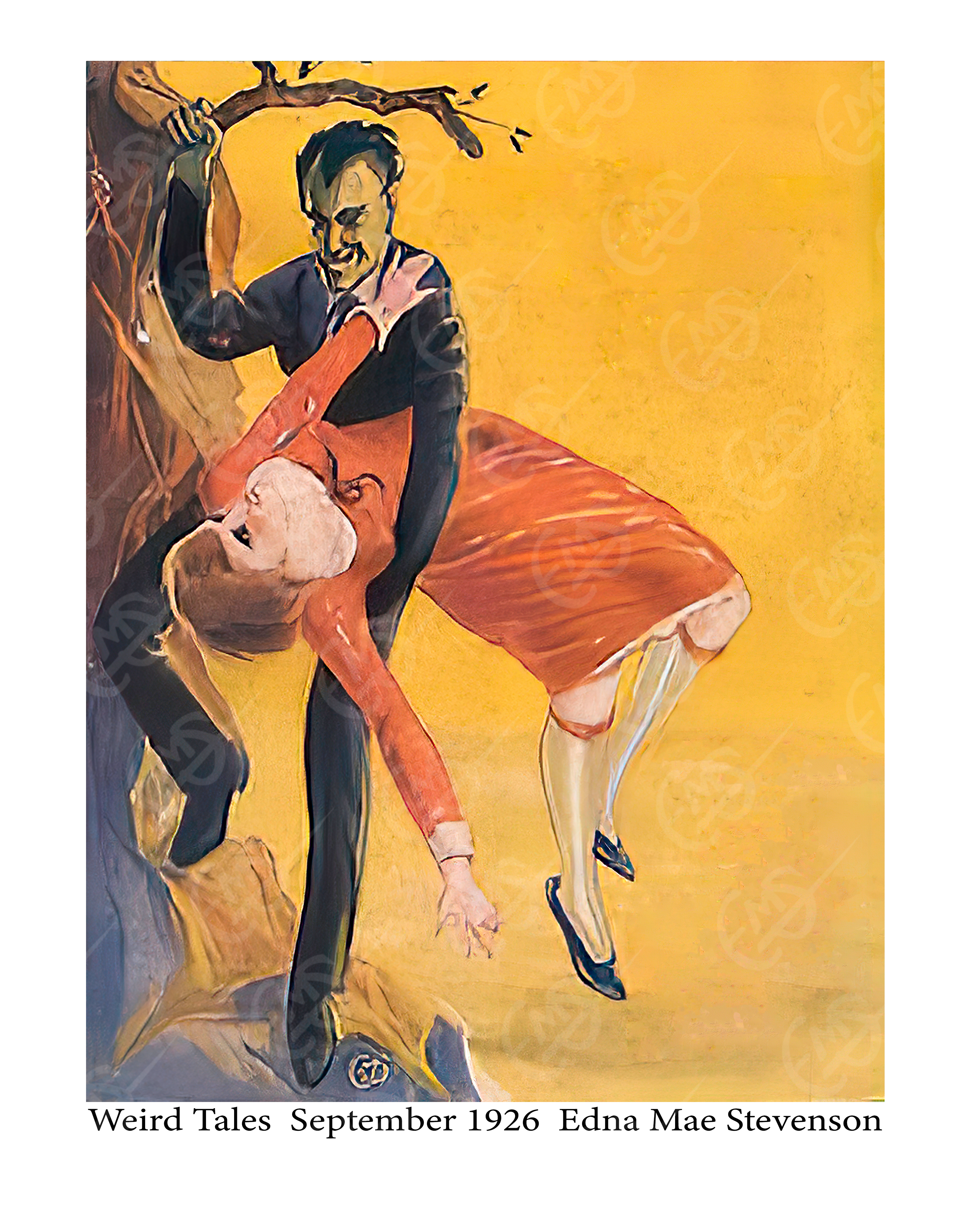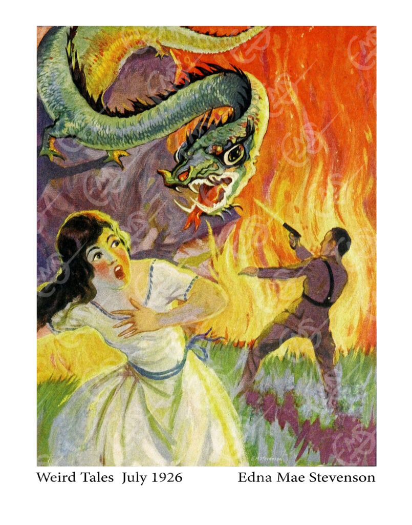 She contracted for 5 covers in 1926 for Weird Tales. At the time many magazines were making the push towards more salacious covers to attract the male audience. Considering her keen moral sense, she would do no more covers after her last cover in November 1926 (that can be found) where a young lady was naked on an altar covered by nothing but a wisp of smoke. This cover (from June 1926) is her best.