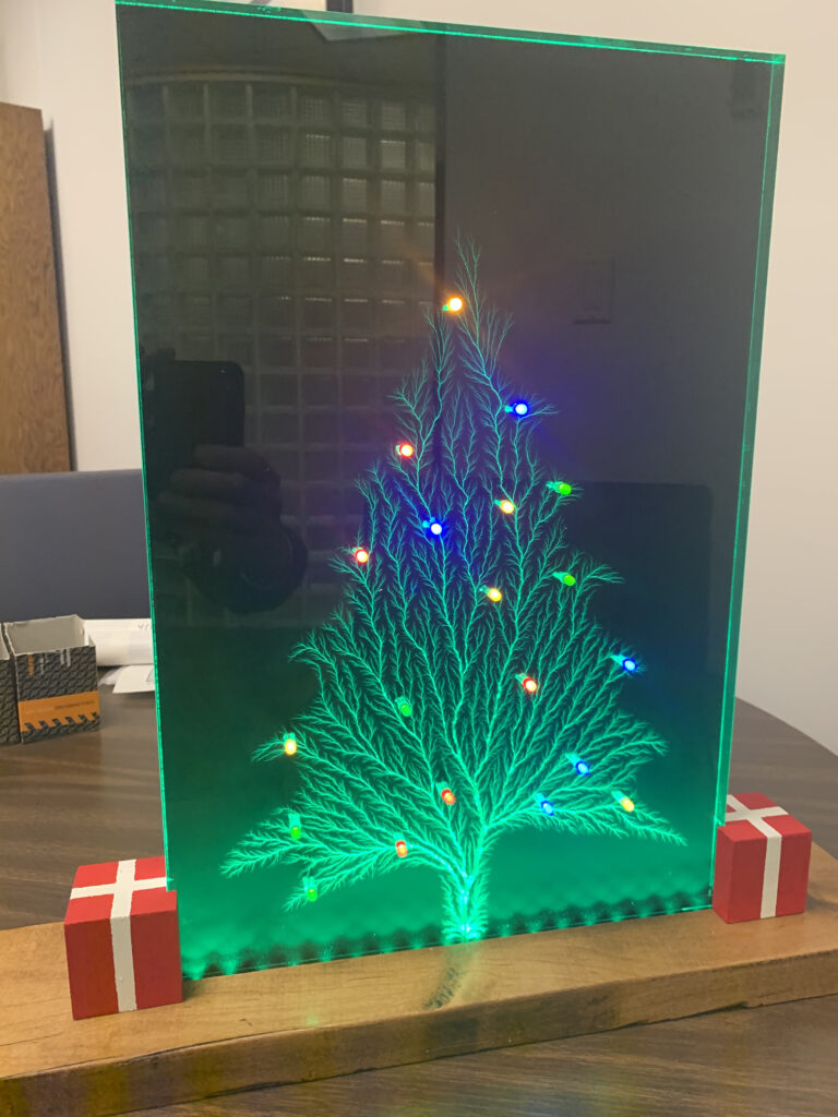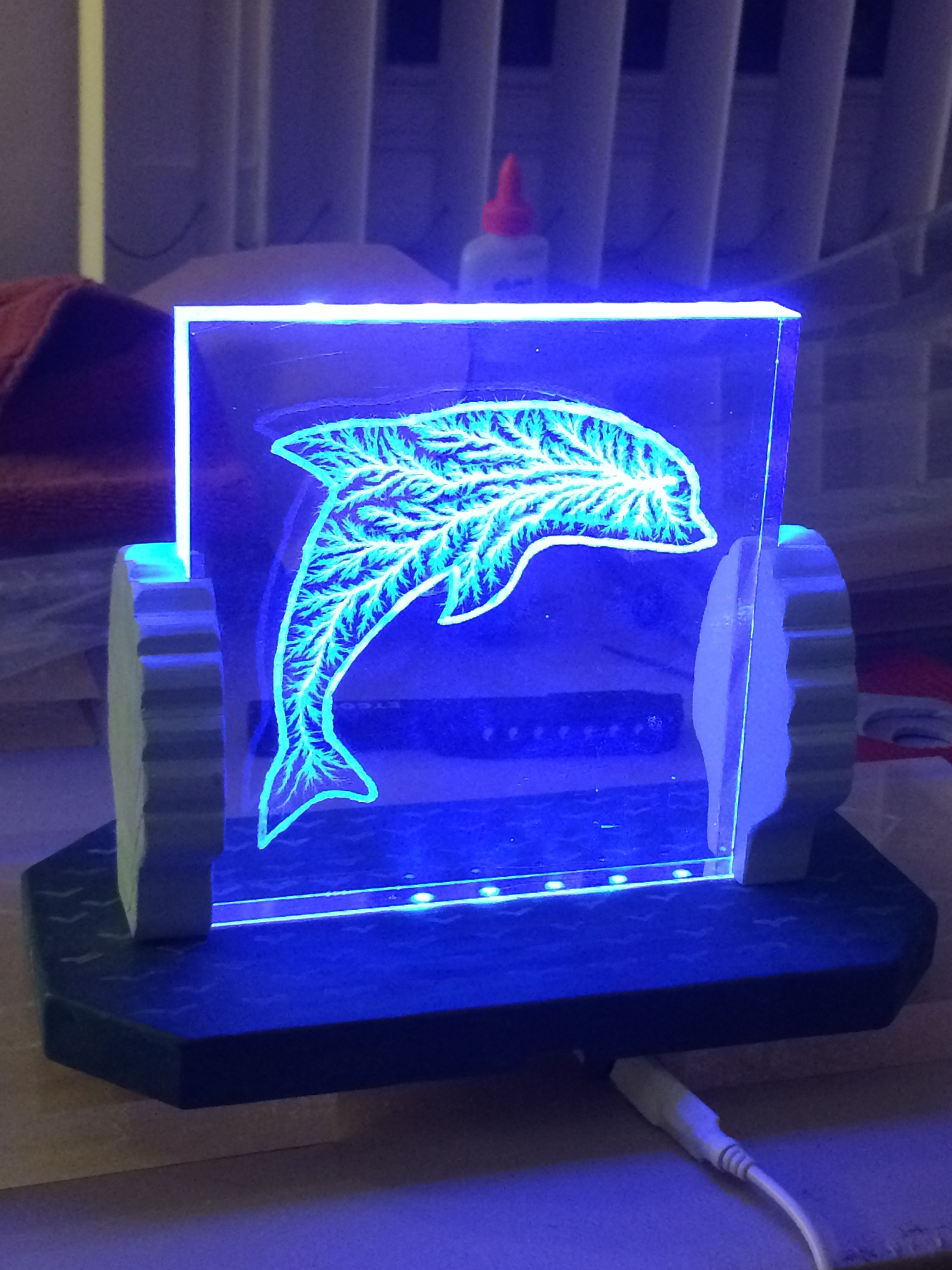 A few years after seeing my first Lichtenberg figure at an art show I had an opportunity to begin making some of my own. Lichtenberg figures are branching patterns created on the surface or interior of an insulating material by a high voltage electrical discharge. After making many rookie mistakes and receiving valuable coaching from others who developed this art form years before me, I am now designing, exposing, and mounting my own unique pieces. I love the challenge of making the discharge flow through the piece in a natural way and creating a beautiful image in what was originally an empty piece of acrylic. I have advanced to stacking several pieces together to allow multiple colors at once as well as to bending and shaping some pieces to add extra dimensions. I have also experimented with adding background colors and other media like LED lights for additional enhancements. I am always keeping one eye open looking for an image or shape to inspire my next piece.